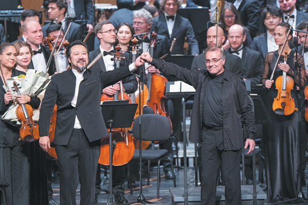 Conductors Lin Daye and Alexander Rudin after the concert in Wuxi in 2024, which marked the first collaboration between the Wuxi Symphony Orchestra and the Russian National Orchestra. CHINA DAILY