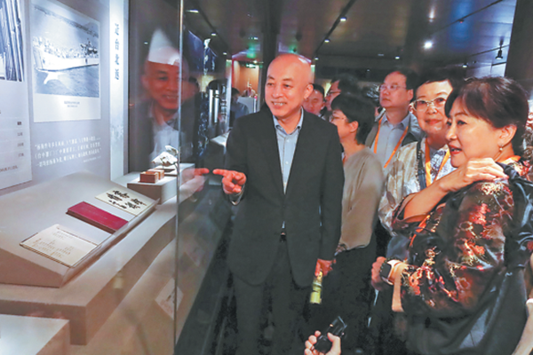 Wang Xudong (left), director of the Palace Museum in Beijing, introduces a cultural relic on Tuesday to guests at the opening ceremony of an exhibition commemorating the southward evacuation of the museum's artifacts in the 1930s. JIANG DONG/CHINA DAILY