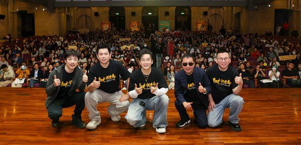 Huang Xiaoming (center) and other major players including Jia Zhangke (second from right) gather to promote the upcoming film Mostly Sunny at Tsinghua University. [Photo provided to chinadaily.com.cn]