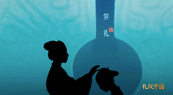A still from Chinese Etiquette & Ceremonies depicts the hair-pinning ritual from the traditional coming-of-age ceremony for girls in ancient China. /CMG