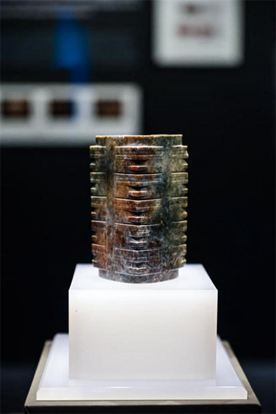 The display features a Liangzhu cultural jade cong artifact dating from 5,300 to 4,300 years ago. [Photo provided to China Daily]