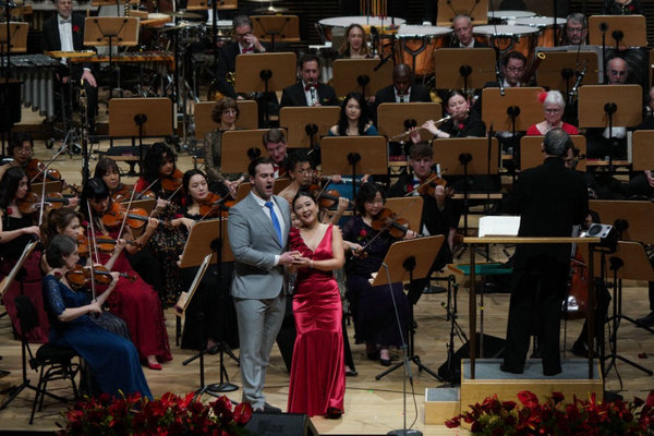 Soprano Kathleen Kim and baritone Andrzej Filonczyk perform with the orchestra during the New York Philharmonic's annual Lunar New Year concert at Wu Tsai Theater in David Geffen Hall on Wednesday. [Photo by Bilin Lin/China Daily]