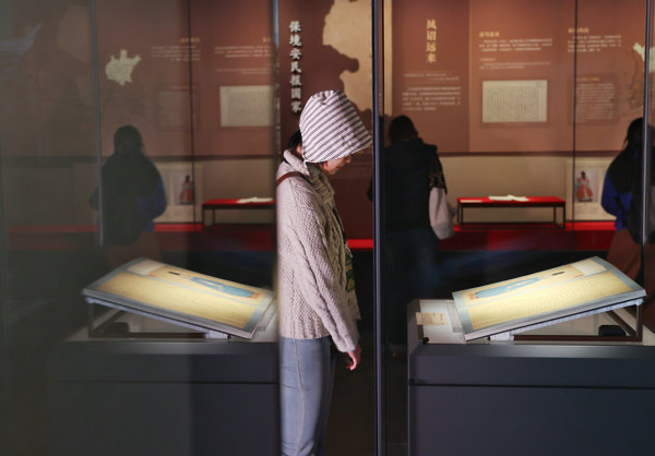 A visitor appreciates archival materials at the Enduring Legacy of Harmony and Beauty: Exhibition on the History and Culture of the Mufu Mansion in Lijiang at Prince Kung's Palace Museum. [Photo by Jiang Dong / China Daily]