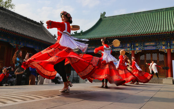 Ethnic Naxi dance is among the exhibition opening's highlights. [Photo by Jiang Dong / China Daily]